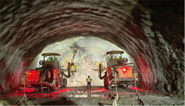 膠州灣二隧3標項目全長7094.5米,由中鐵隧道局集團有限公司承建。該段地層以花崗巖為主,強度較高,需采用爆破法施工。志高機械研發(fā)生產(chǎn)的地下三臂臺車——UJ33在鉆孔過程在發(fā)揮了重要作用。它機載177 kw康明斯發(fā)動機,動力強勁;同時搭配ZY104M鑿巖機,鉆具損耗小,使用壽命長。每臺設(shè)備都有三條工作臂,兩臺設(shè)備同時工作,六條工作臂在不同方向和位置鉆孔,提高了鉆孔效率,為保證工程進度保駕護航。