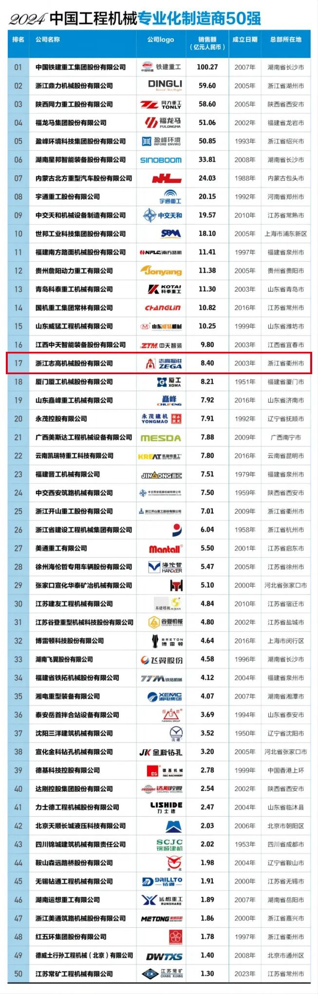 排行榜中,志高機(jī)械位列第17位