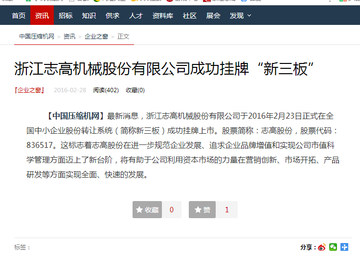【中國壓縮機(jī)網(wǎng)】對(duì)浙江志高機(jī)械股份有限公司2016年2月掛牌新三板進(jìn)行了報(bào)道,一下是報(bào)道截圖: