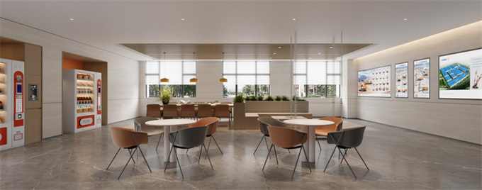 (1)大廳:設(shè)置洽談區(qū)和書吧,滿足接待洽談與員工閱讀學(xué)習(xí)需求;24小時直飲水機(jī)和日用品售賣機(jī)提供全天候補(bǔ)給服務(wù)。