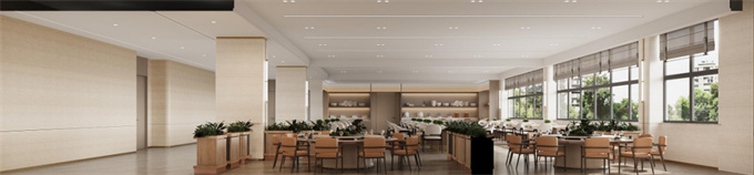 (3)餐廳:可同時容納80人,采用酒店早餐島臺式取餐動線,提高就餐效率。