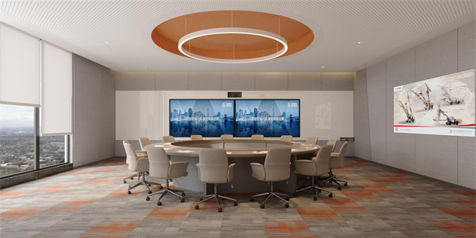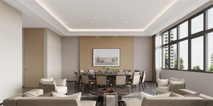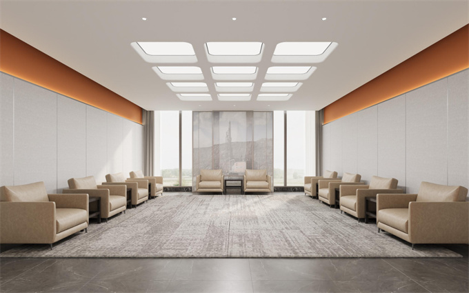 (1)專業(yè)接待室:中央雙主沙發(fā)+定制屏風(fēng)背景,側(cè)翼設(shè)8座洽談區(qū),滿足政企接待需求。